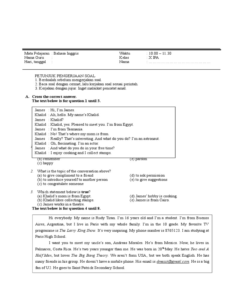 Soal introduction yourself kelas 10 sma. Berikut bospedia memberikan Soal UAS BAHASA INGGRIS Kelas 10 SMAMA PETUNJUK UMUM 1. Please introduce yourself e. Nah kakak juga akan membagikan kunci jawabannya disetiap soal.